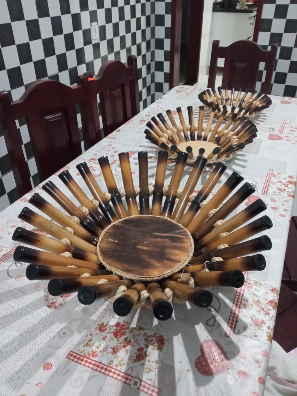 Conjunto de centro de mesa artesanal feito em bambu, ideal para decorar mesas de jantar, cozinhas ou áreas gourmet.