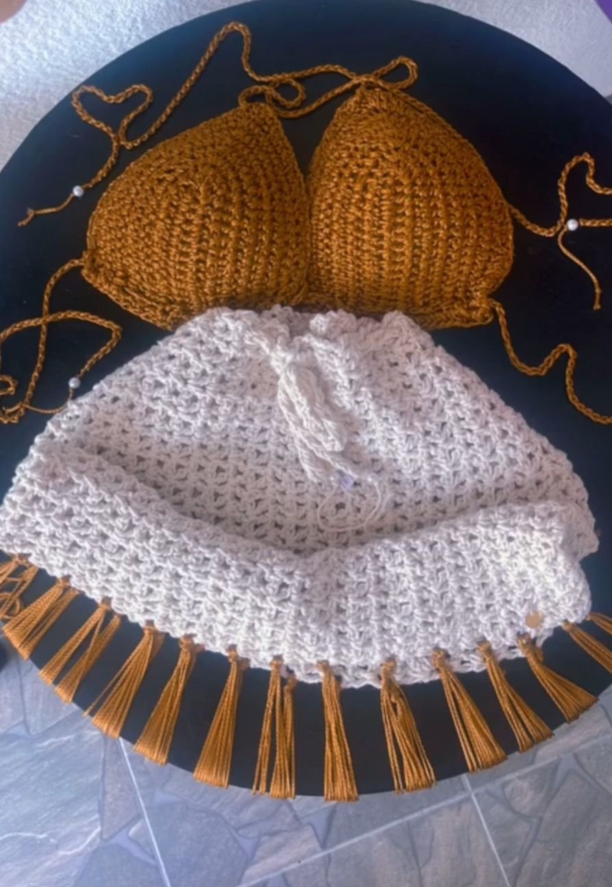 Conjunto artesanal composto por top e saia com franjas, estilo boho e acabamento impecável. Ideal para praia, ensaios fotográficos e looks cheios de personalidade.