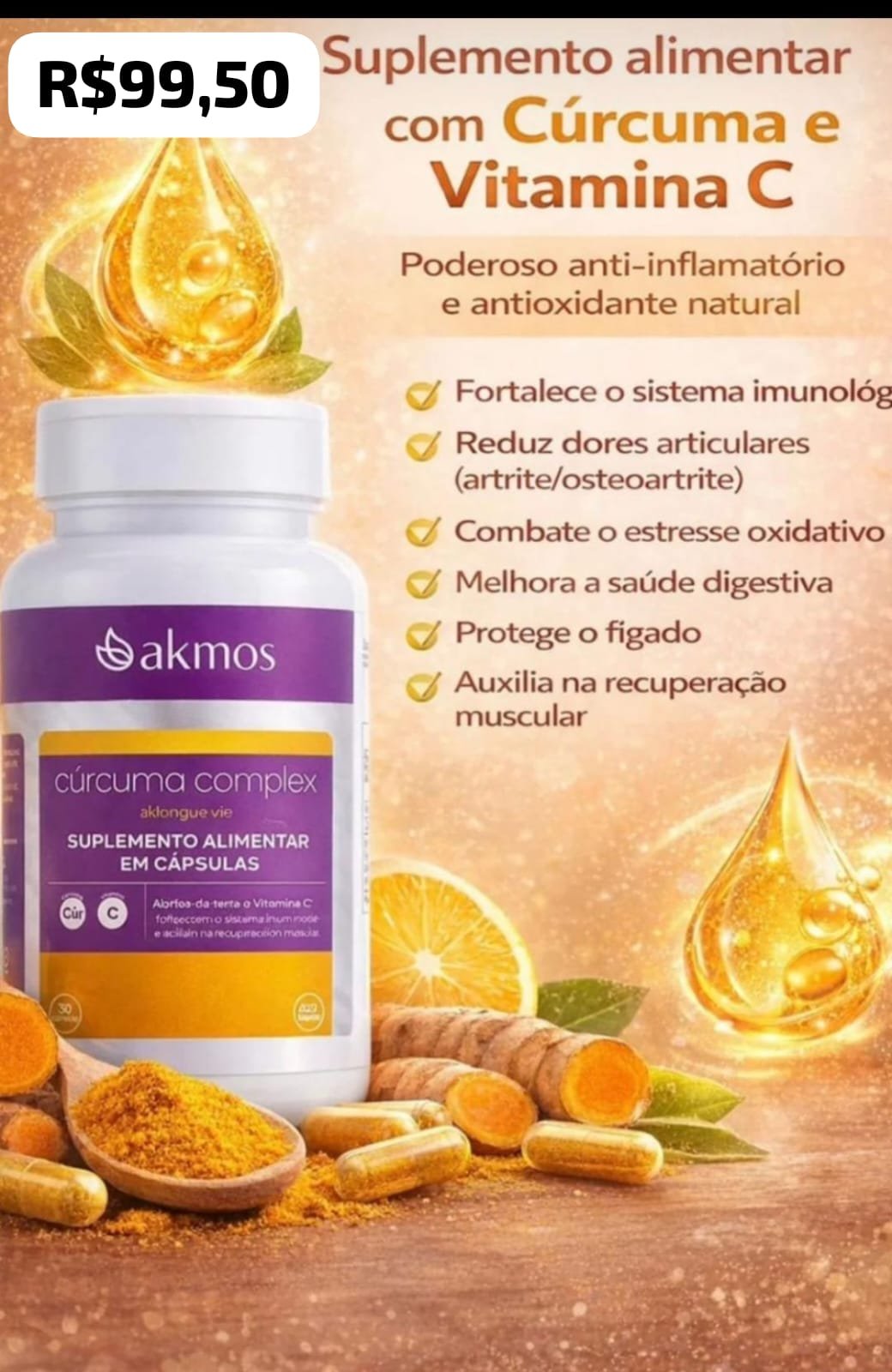 Suplemento alimentar com Cúrcuma e Vitamina C! Antiinflamatório e antioxidante natural! Reduz dores articulares e melhora a saúde do fígado!