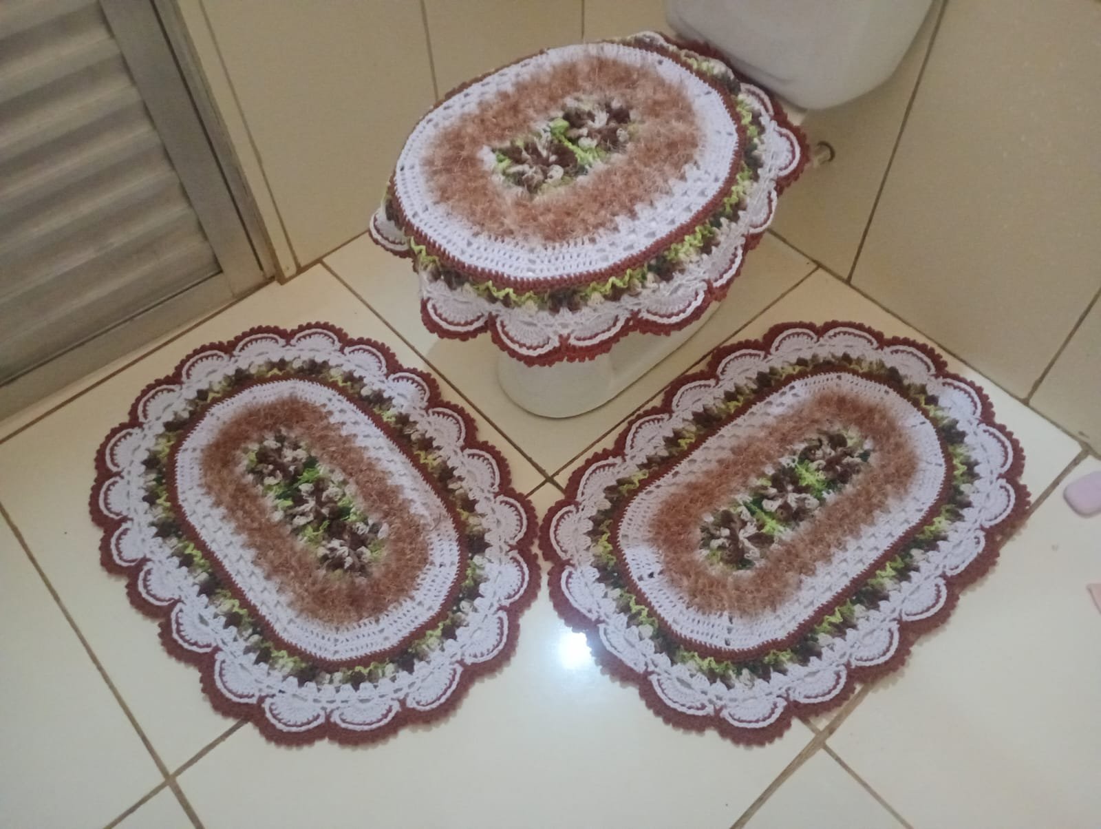 Jogo de banheiro em crochê feito à mão, ideal para deixar o ambiente mais aconchegante e elegante.