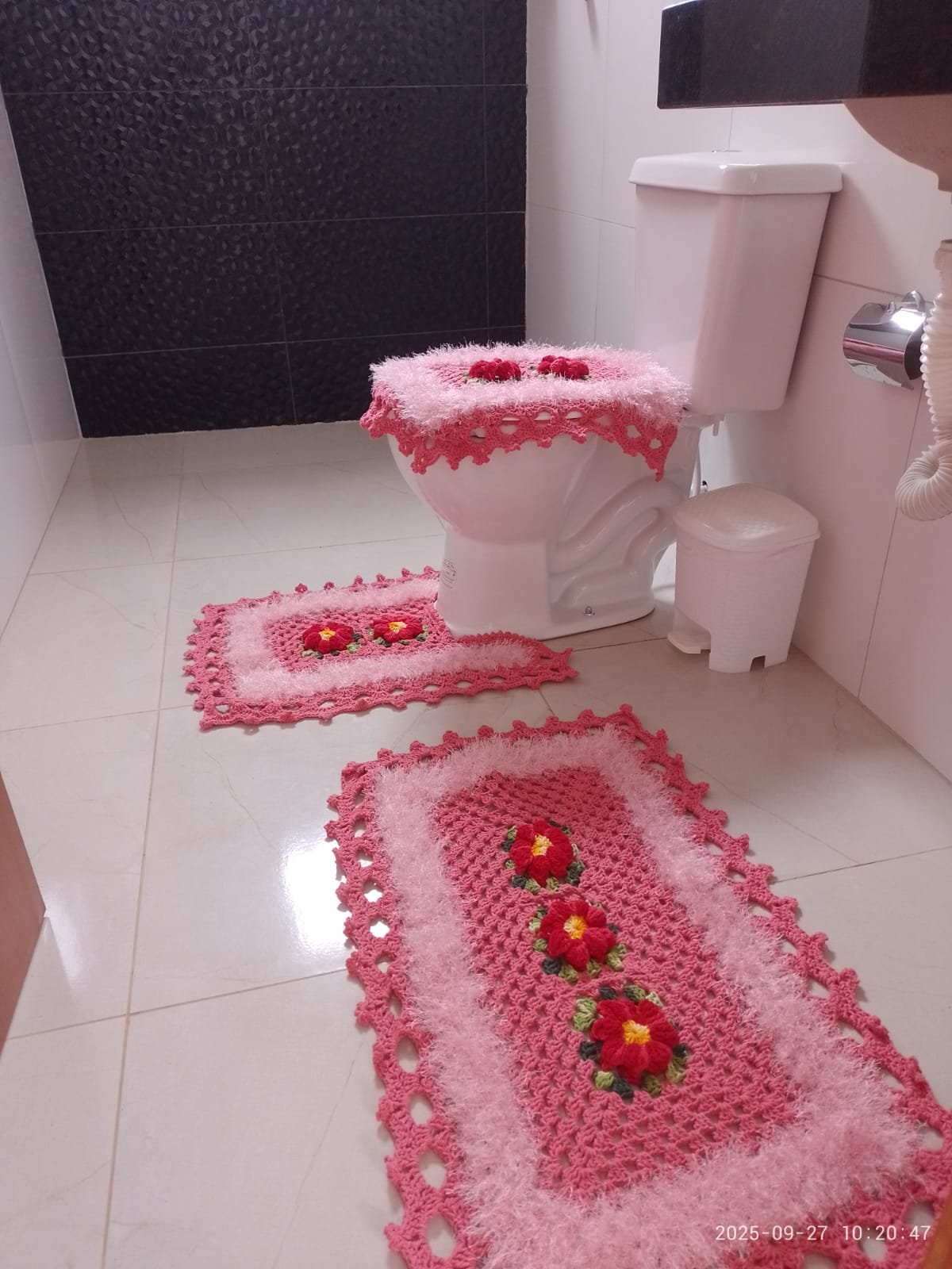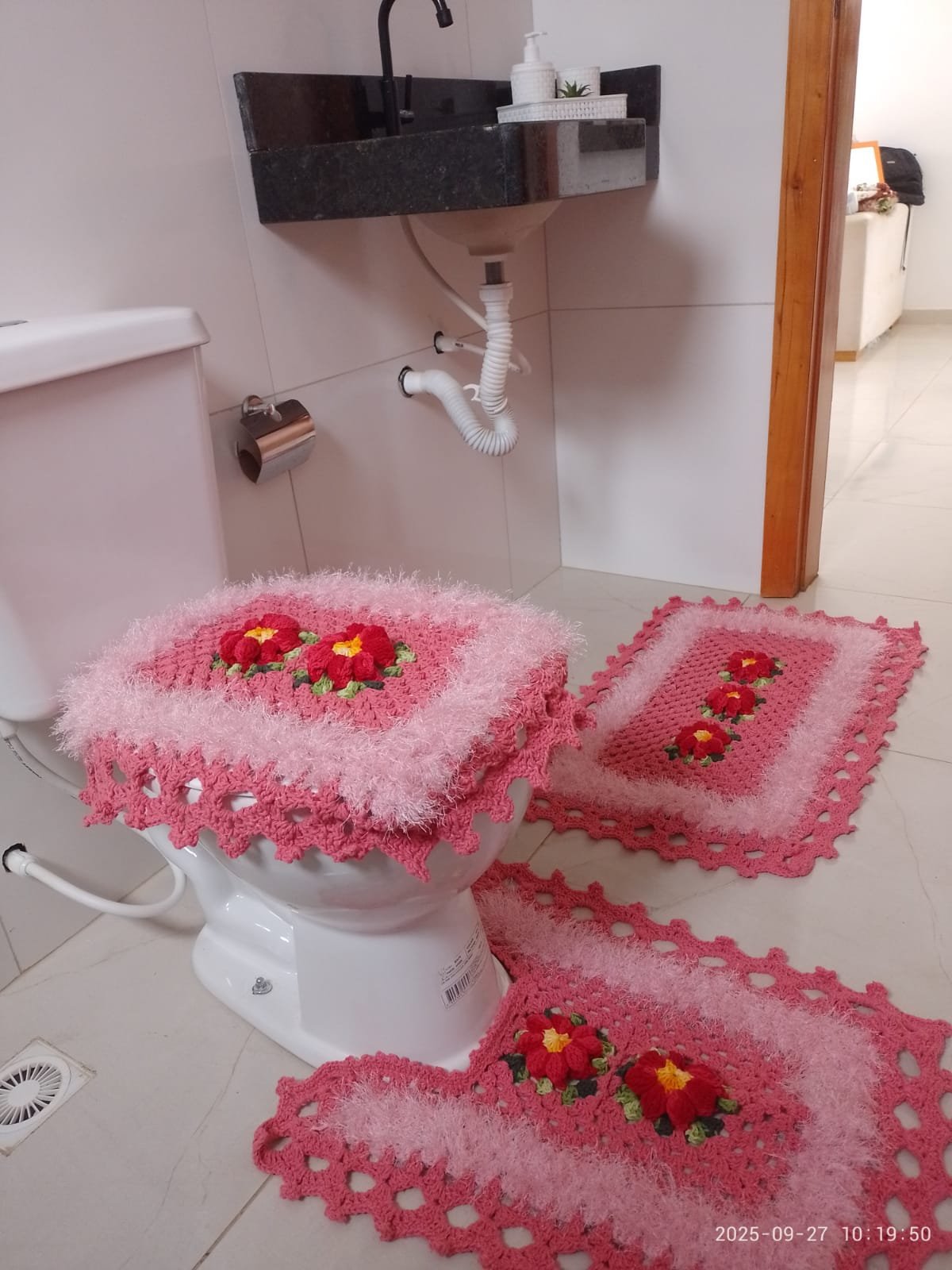Jogo de banheiro artesanal em crochê com detalhes florais e acabamento delicado.
