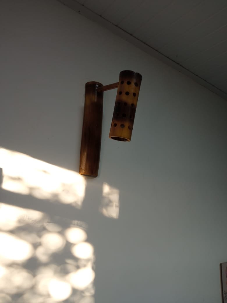 Suporte de parede artesanal em bambu para luminária, perfeito para ambientes rústicos e aconchegantes.